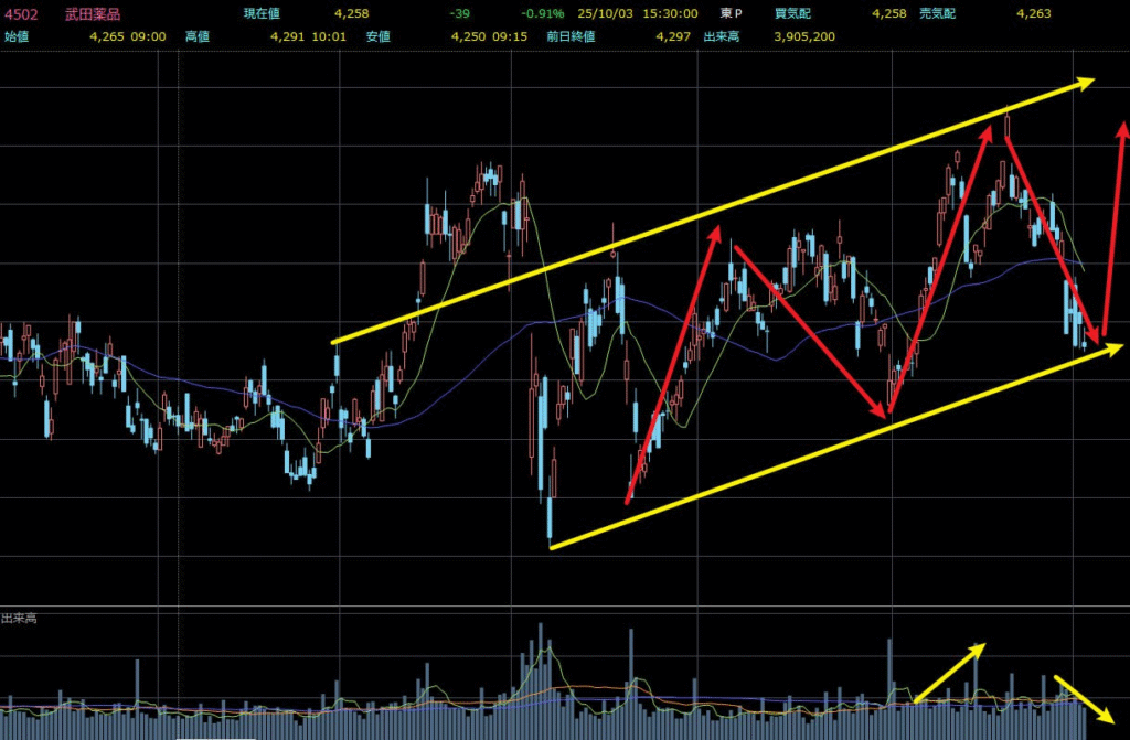 テクニカル面では、株価は総じて上昇トレンドを維持しており、足元の下落はあくまで正常なテクニカル調整と見ています。出来高の推移を見ると、調整局面では出来高が細っており、機関投資家の資金が退いているわけではなく、むしろ意図的な「売り崩し」をうかがわせます。現在はサポート近辺で下げ止まりが進みつつあり、今後の上昇再開が期待できる局面です。したがって、この銘柄は引き続きしっかり保有し、サポートの有効性が確認できた段階で、無理のない範囲での小幅な買い増しを検討してよいと考えます。