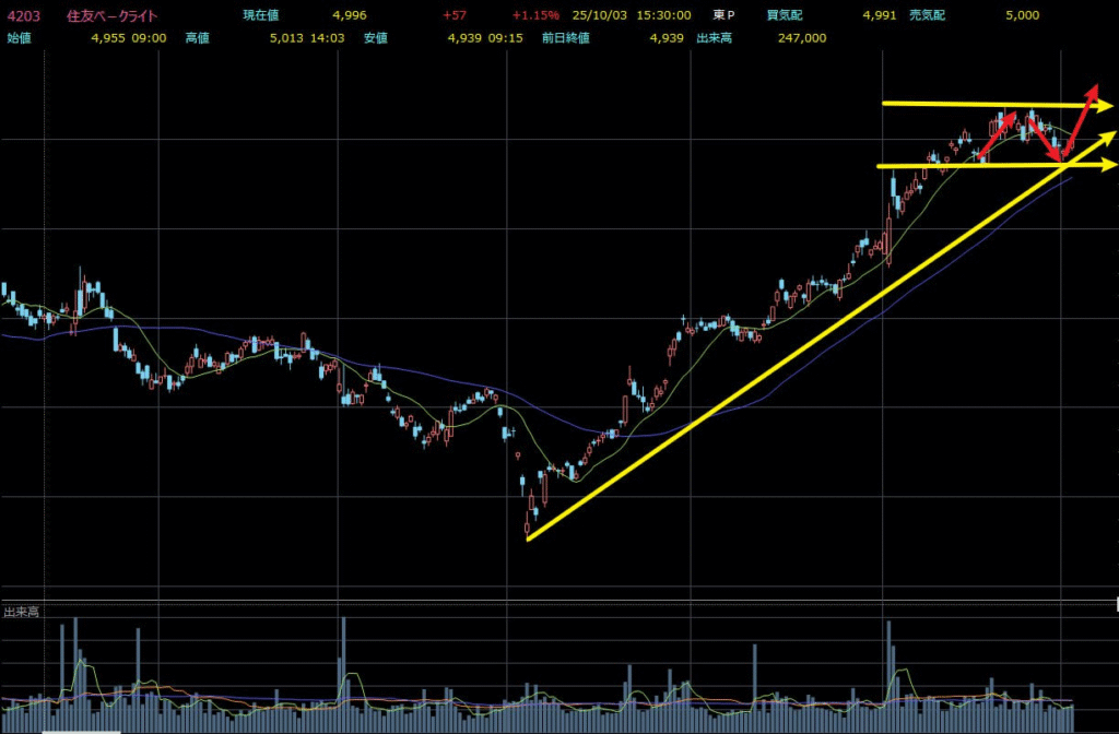 テクニカル面では、チャート全体は着実な上昇基調を維持し、移動平均線は典型的な買い手が多いことを示しています。直近は高値圏で持ち合いが続いていますが、出来高推移やローソク足の形状から判断すると、これは典型的な「振い落とし」に近い動きで、主力資金が短期の含みポジションを整理しつつ次の上昇への地ならしをしている局面と見られます。現在の保有分は含み益のゾーンにありますが、トレンドと需給の形はまだ売り時を示していません。今後も出来高を伴う大きな下落が出現せず、上昇トレンドが崩れない限り、安心して保有継続が良いです。