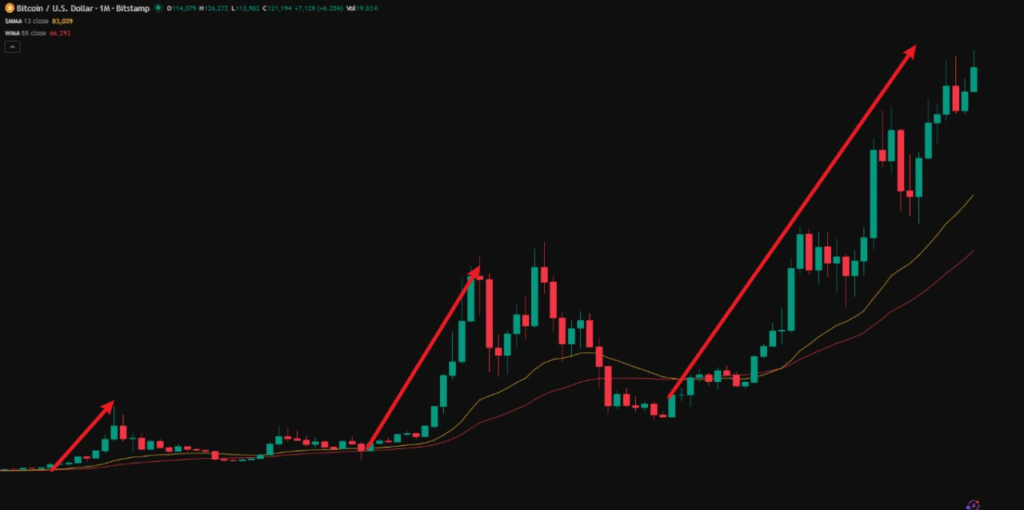 図中の赤いマークからも分かるように、ビットコインの月足チャートでは各サイクルの上昇幅が次第に拡大しています。