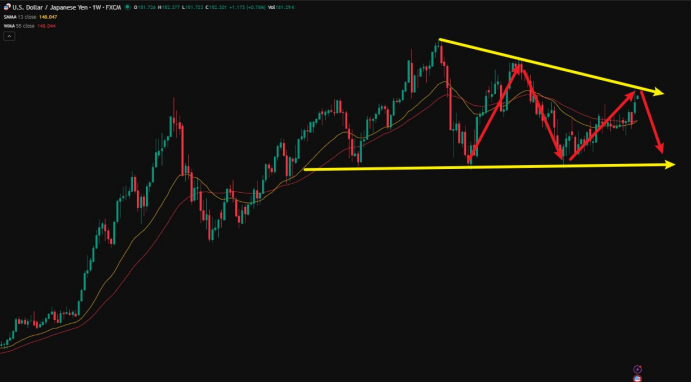 ドル/円の週足の動きを見ると、現在の為替はレジスタンスに接近しており、今後は円高局面に入る可能性があります。