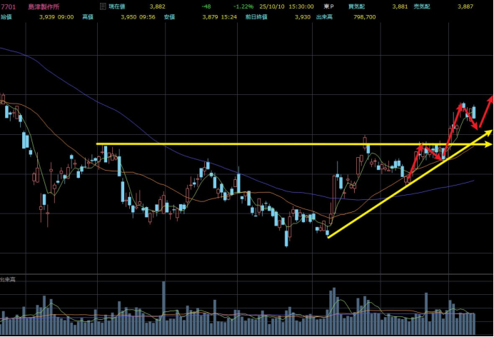 足元は高値圏でのもみ合い局面ですが、押し目時も出来高が膨らんでおらず、上値の売り圧力は限定的で資金は引き続き市場内にとどまっています。