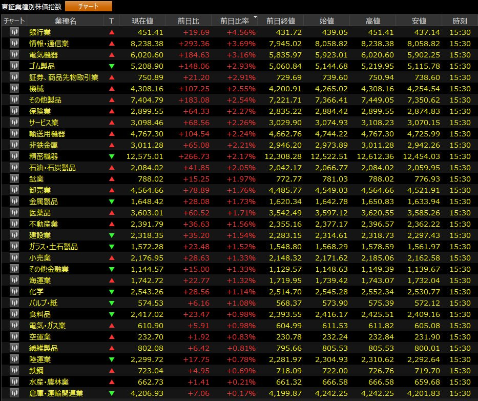 本日、業種別に見ると、銀行業、電気機器、情報・通信業、ゴム製品などが上昇率上位となりました。