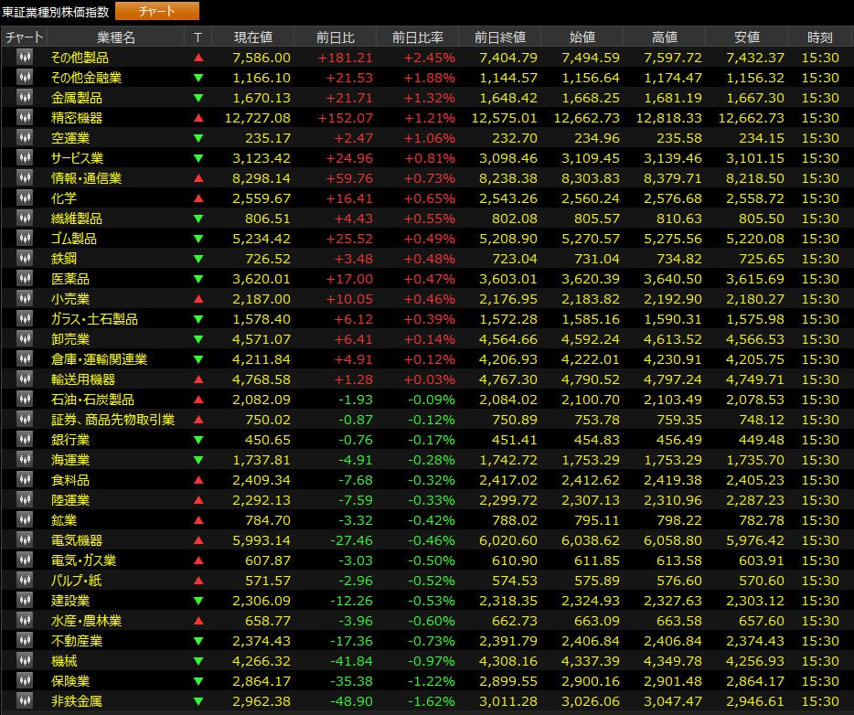本日の業種別の動きを見ると、上昇を主導したのは「その他製品」「その他金融サービス」「金属製品」「精密機器」などの分野でした。