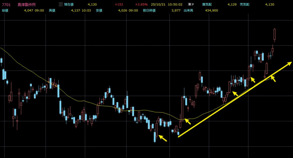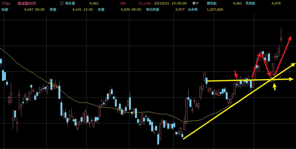 昨晩はローソク足形態の「底部大陽線」について学び、事例として7701(島津製作所)を用いて解説しました。