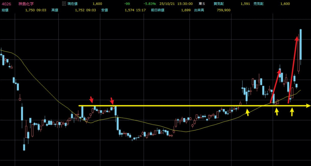 その後、相場が落ち着くにつれて株価は再び上昇に転じ、最終的には十分な利益を得ることができました。