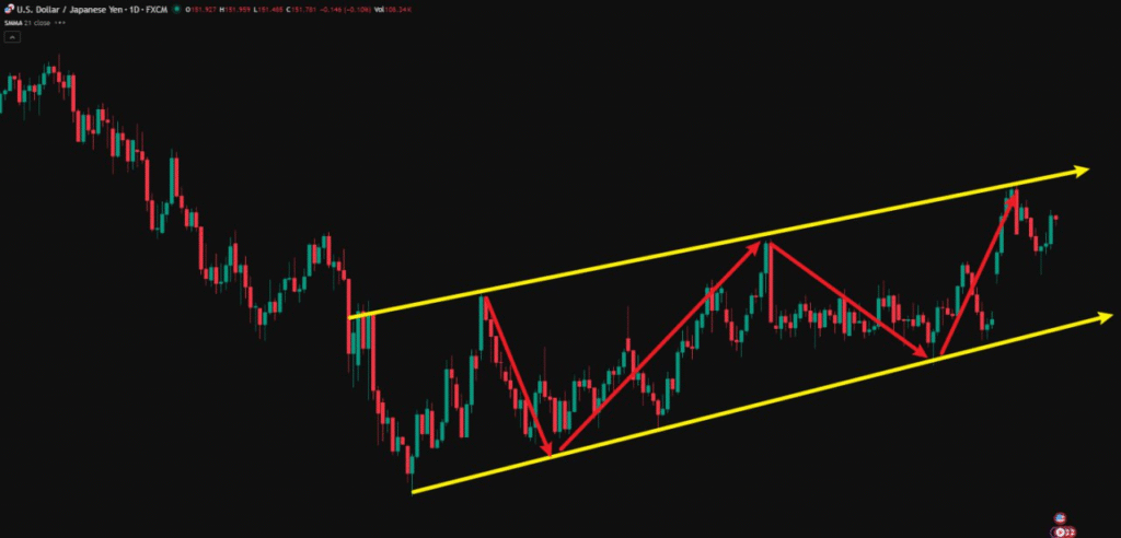日足チャートを見ると、もみ合いの後にいったん下落し、重要サポート帯で下げ止まり、その後はじわりと切り上がり始めています。