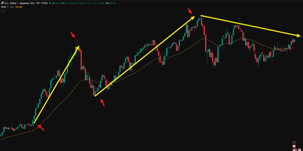 利上げの影響で、ドルに関連する通貨ペアは一方向のトレンドを形成し、たとえばドル/円(USD/JPY)が代表例でした。