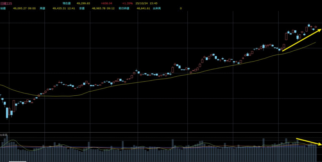 チャートのとおり、直近の上昇局面では出来高が継続的に縮小し、21日以降は上値を試した後に押し戻される動きが見られます。