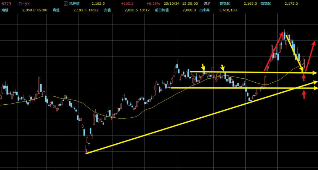 例えば、私たちが保有している 6323 ローツェについて、昨日もお伝えしたとおり、図の赤いマークの箇所で株価がサポートラインに接近しており、2000円割れでの買い増しを推奨しました。