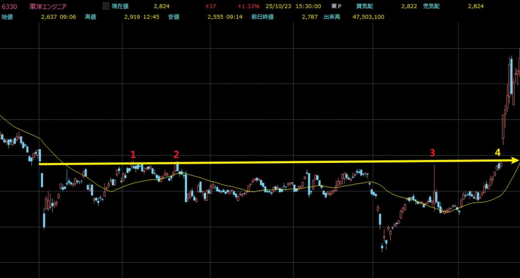 図中1でいったん上昇後に押し戻されたのち、784円付近にレジスタンスラインが形成されました。