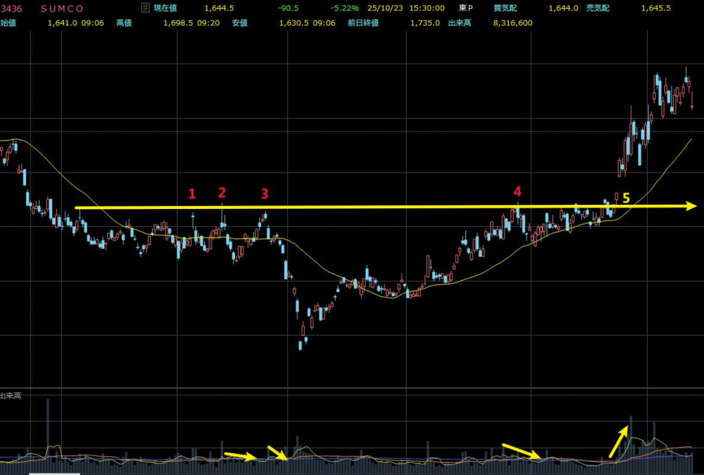 出来高密集帯: 株価の上昇過程で出来高が明確に膨らんだ価格帯は、潜在的なレジスタンスとなりやすい領域です。