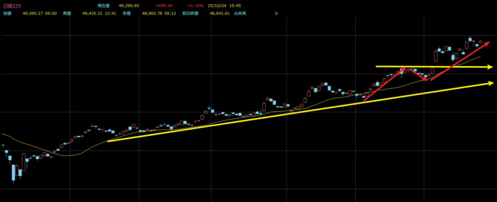 そのため、最近では投資家の心理が徐々に慎重姿勢へと傾き、日経平均株価は高値圏での乱高下が続き、買いの勢いが明らかに弱まっています。