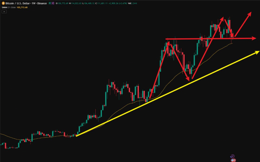 週足チャートのパターンを見る限り、ビットコインは依然としての上昇トレンドをよく保っており、むしろ今回の調整は次の上昇に向けたエネルギー蓄積の段階といえます。