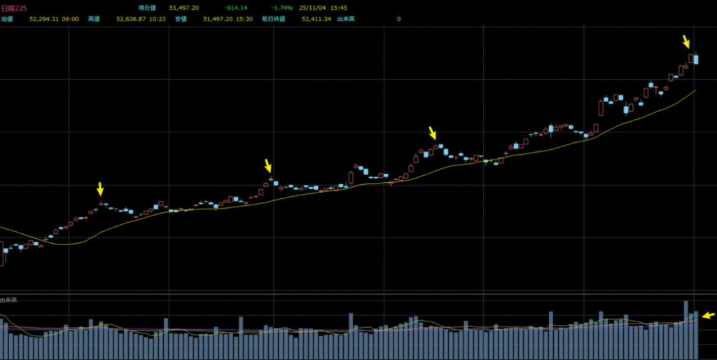 また今度詳しく解説しますが、このような形が高値圏で現れ、出来高の増加を伴って下落した場合には、主力筋による利食いや撤退を示唆することが多いです。