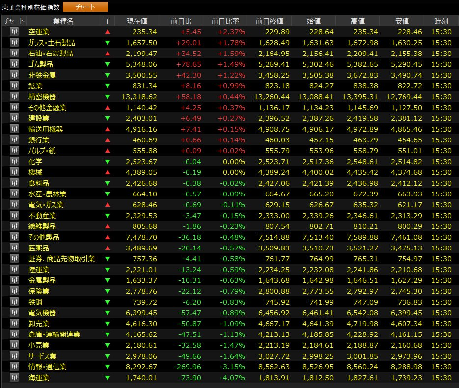 業種別で見ると、今日は空運業、ガラス・土石製品、非鉄金属、ゴム製品などのセクターが上昇した一方で、テクノロジー株には明確な二極化が見られました。