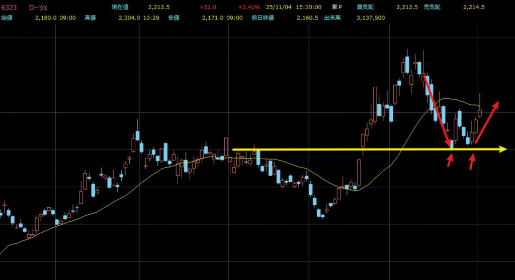 テクニカル分析から見ると、6323の株価はすでにサポートラインで下げ止まり、無事反発に転じています。