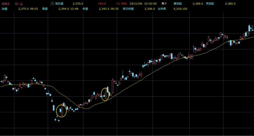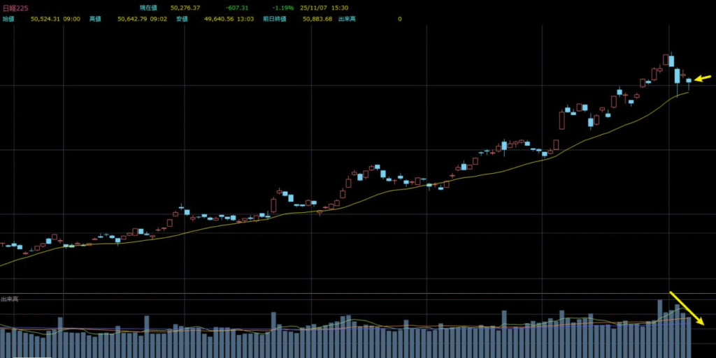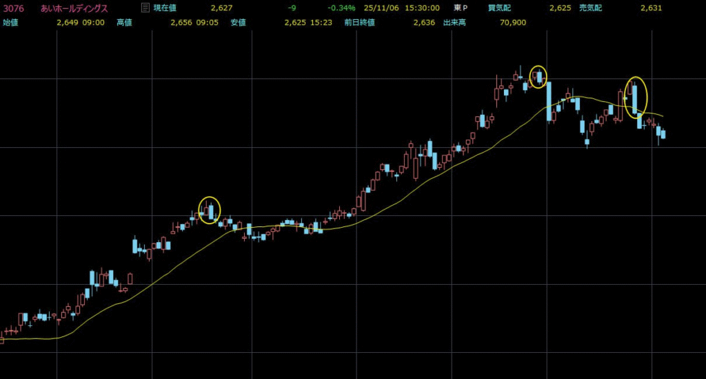 高値圏でこのパターンが出れば、大口資金の利益確定が始まったサインです。