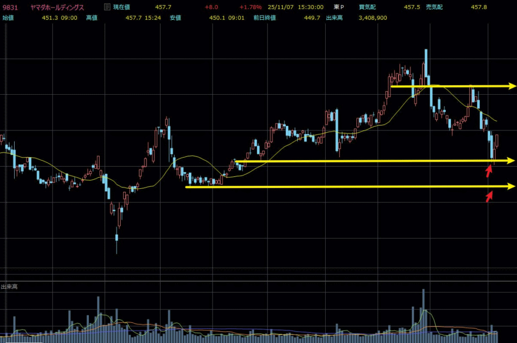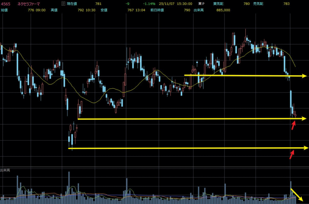 足もとでの下落は出来高を伴っており、パニック的な投げ売りが概ね一巡したことを示唆します。