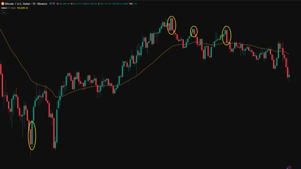 上昇過程で、図の最初のマークに陰の包み足が出現し、その後に下落が続きました。