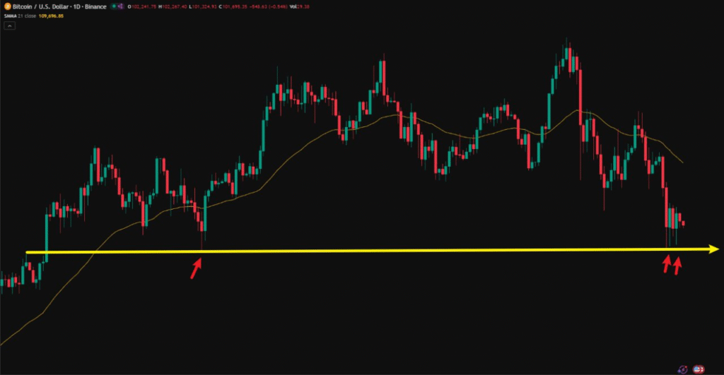 図のとおり、テクニカル面では10万ドル近辺で強いサポートを得ており、この価格帯は繰り返し検証された重要なサポートゾーンです。